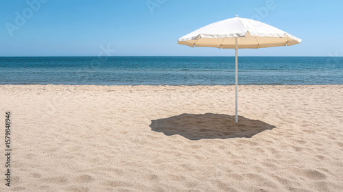 Beach umbrella casting shadow on empty sand, creating serene atmosphere by ocean