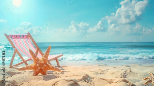 Beach vacation landing page design,summer theme, beach chair, surfboard, starfish on white sandy shore, blue ocean horizon,blue sea landscape for travel banner concept,space for text.