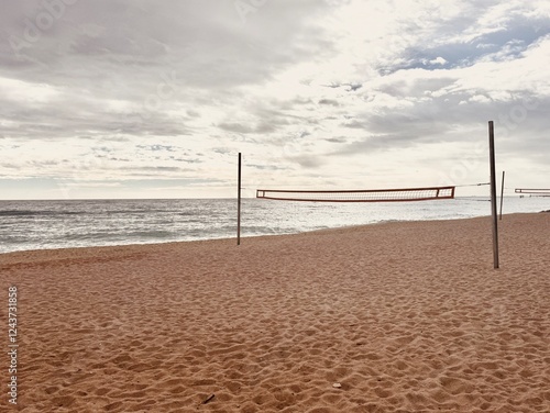 Beach volleyball net on the beach.