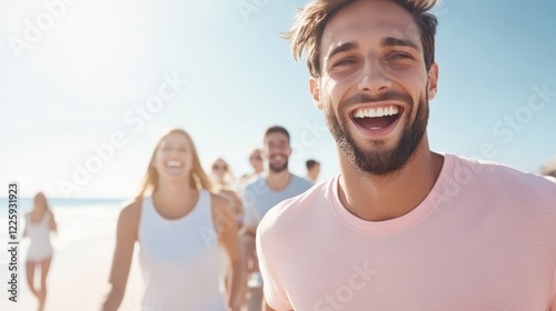 Beachside Joy: A group of carefree friends enjoying the sunshine and the beach, their laughter echoing through the air. The man in the foreground beams with happiness.