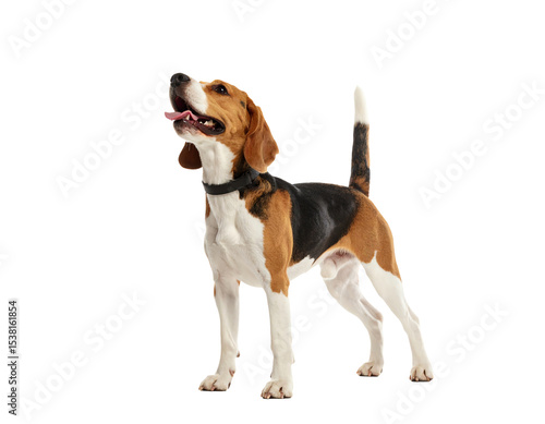 Beagle dog standing alert and happy outdoors.