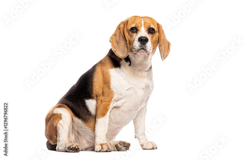 Beagle sitting and looking forward on a white background