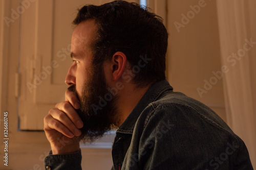 Bearded man sits next to a thoughtful window.
