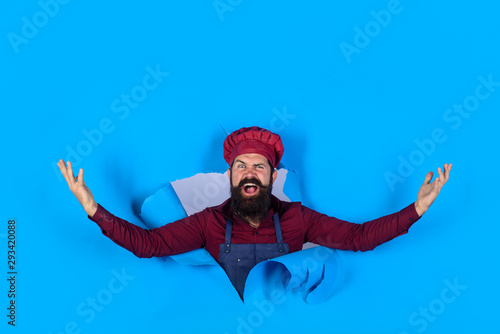 Bearded man through paper. Happy chef. Oatmeal. Professional chef. Bearded cook in kitchen. Chief man in cook uniform. Discount. Sale.