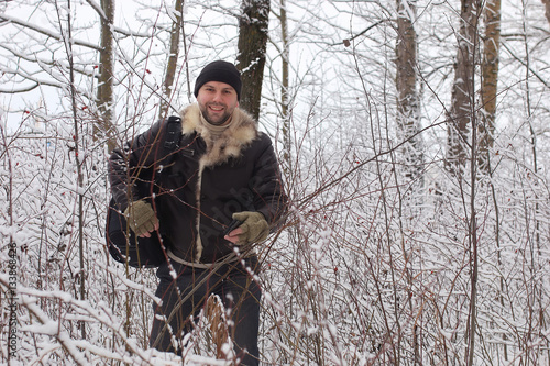 bearded man walking in a winter park