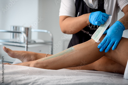 Beautician waxing woman a leg at salon / Depilation.