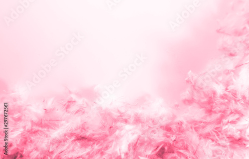 Beautiful abstract blue and purple feathers frame on darkness background and colorful soft white pink feather portrait frame texture