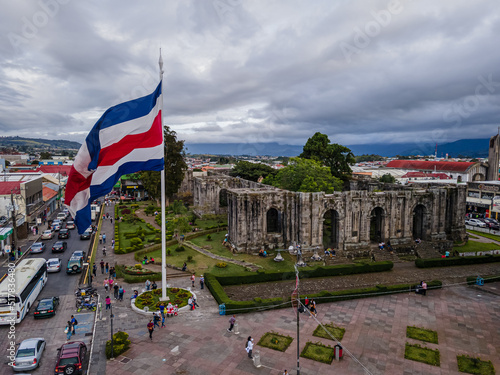 Beautiful aerial night view of the city of Cartago ruines and the Bicentennial monuments and the Costa Rica Flag