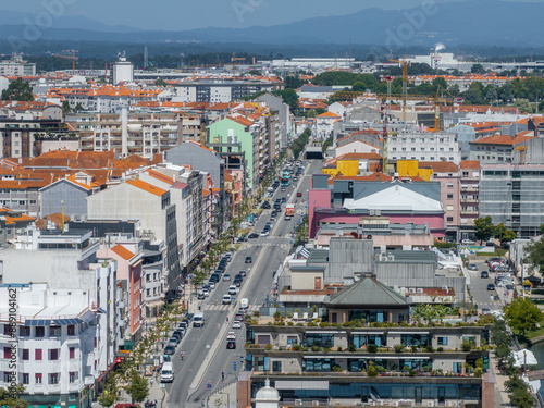 Beautiful aerial view of Aveiro city in Portugal. Aveiro Water canal of Ria de Aveiro with typical boats and tourists, cityscape in the background.