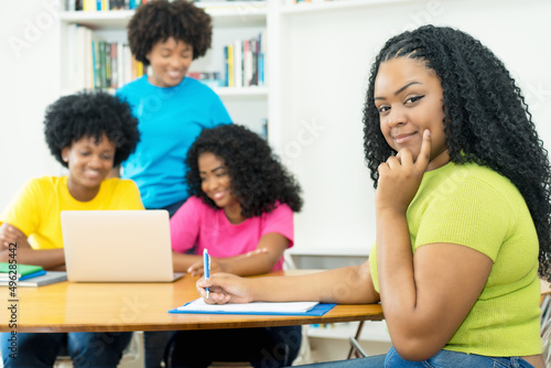 Beautiful african american computer science student with group of coding students