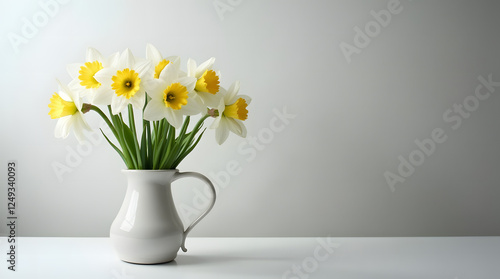 Beautiful and elegant white daffodils arranged in a minimalist vase on a gradient background.