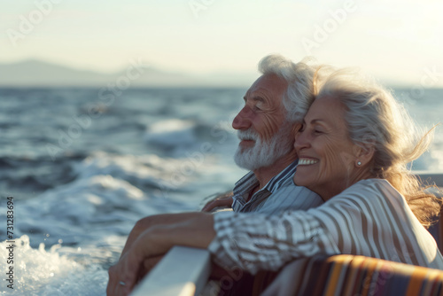 Beautiful and happy senior couple in love sitting on the side of sailboat or yacht deck floating in sea at sunset and enjoying amazing view, sailing together