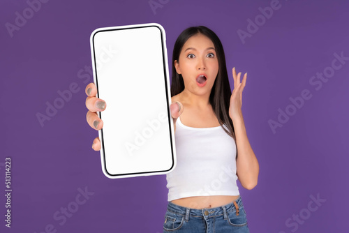 Beautiful Asian brunette woman cute girl in white tank top ,Excited surprised girl showing big smart phone with blank screen , white screen isolated purple background , Mock Up Image