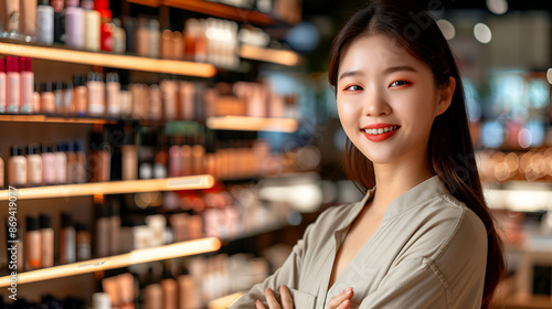 Beautiful Asian Korean female cosmetic seller consultant in modern luxury cosmetic store. Beauty industry, customer service concept.
