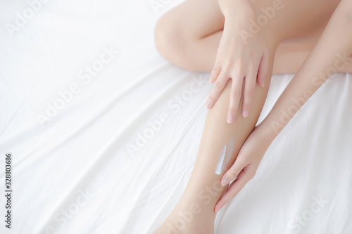 Beautiful asian woman touch skin leg smooth with cream and lotion for hydration and smooth, girl applying body care and cosmetic for silky and soft, beauty perfect with wellness, health and care.