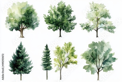 Beautiful assortment of green trees in watercolor isolated on white background showcasing nature's diversity, Assorted green trees in watercolor, isolated on white, for detailed landscape