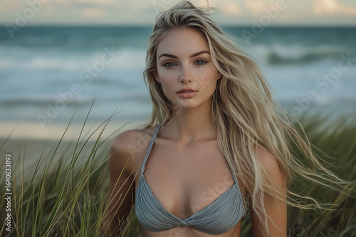 Beautiful blonde woman in bikini on a sandy beach with ocean waves
