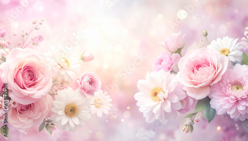 Beautiful bouquet of pink roses and white daisies on soft background