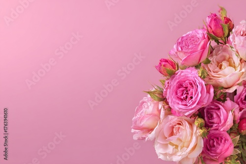 Beautiful Bouquet of Pink Roses on a Soft Pink Background for a Cheerful Decoration