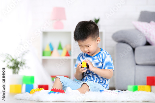 Beautiful boy sitting and playing with plastic toys at home
