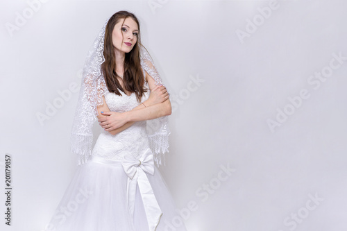 beautiful bride in white wedding dress in different poses on white backgrounds shows different emotions