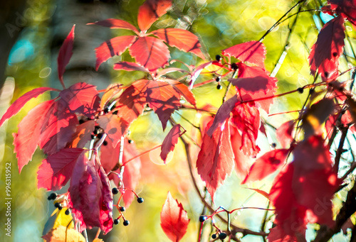 Beautiful bright autumn nature background. Multicolored grape leaves