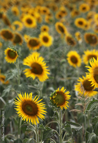 Beautiful bright yellow sunflowers in a large field in farming country near Toowoomba, Queensland, Australia