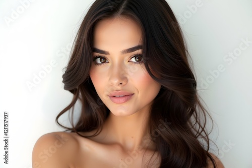 Beautiful brunette girl in move with a perfectly smooth hair, and classic make-up.