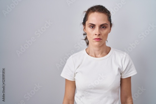 Beautiful brunette woman standing over isolated background skeptic and nervous, frowning upset because of problem. negative person.