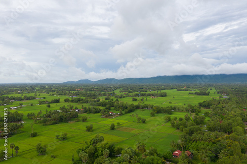 beautiful but unfocussed green grass after rain with dark cloudy sky green ricefield isolated in the island pangandaran . Scenic view of green ricefields in the Cambodia