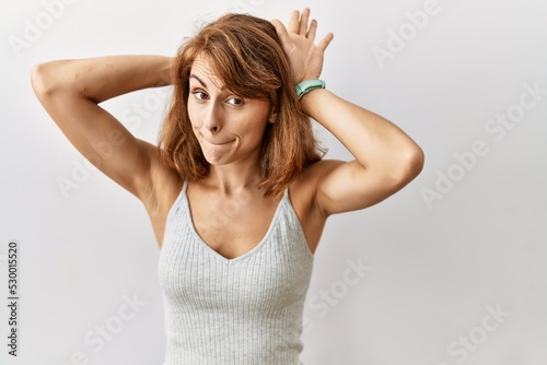 Beautiful caucasian woman standing over isolated background doing bunny ears gesture with hands palms looking cynical and skeptical. easter rabbit concept.