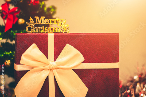 Beautiful Christmas gift boxes on floor near fir tree.