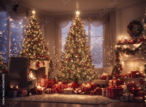 Beautiful Christmas room interior with decorated Christmas tree, gifts, lights and fireplace