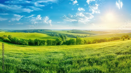 Beautiful countryside in Ukraine Europe Summertime nature photo of lush green pastures and clear blue sky Explore Earth's beauty Copy space image. Generative AI