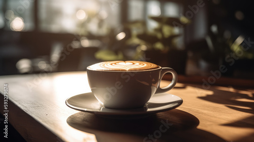 Beautiful cup of coffee standing on a wooden table in the morning light. Generative AI.