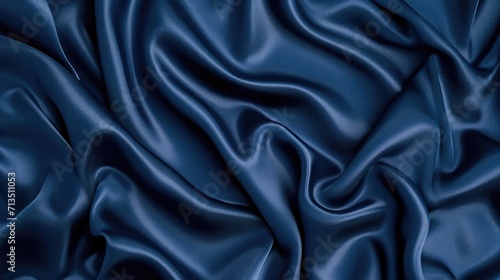 Beautiful dark blue silk satin background. Soft folds on shiny fabric. Luxury background with copy space for text, design. Web banner. Flat lay, top view table.Birthday, Christmas, Valentine's Day.