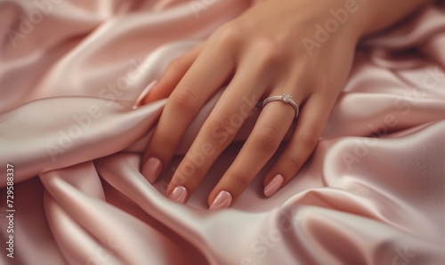 beautiful female hand with elegant ring on neutral paled rose color silk material