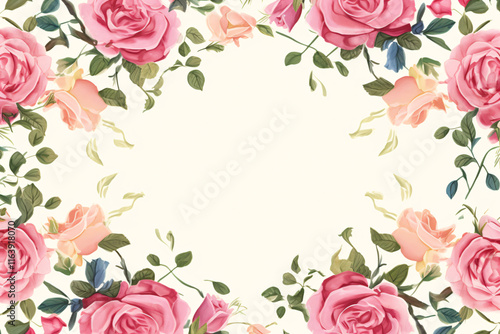 Beautiful Floral Border with Pink and Cream Roses, Green Leaves, and Soft Background for Elegant Designs and Creative Projects