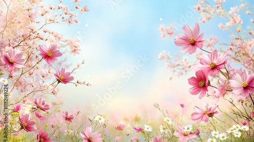 Beautiful Floral Landscape with Pink Flowers and Soft Blue Sky Background