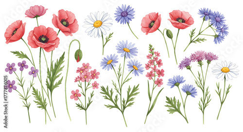 Beautiful floral set with watercolor hand drawn summer wild field flowers. Stock illustration. Clip art