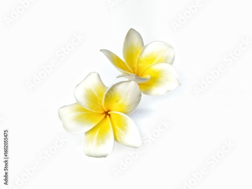 Beautiful frangipani flowers (plumeria alba) isolated on white background. Botanical photography for creative Design