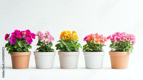Beautiful fresh flower plants in simple pots With a clean white background.