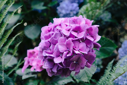 Beautiful fresh purple hydrangea flower in full bloom in the garden, close up. Blooming summer flowering plants, dark green leaves background. Copy space.