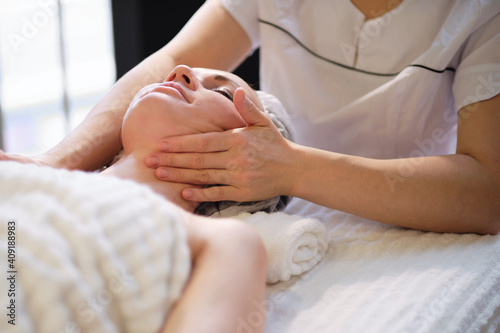 Beautiful girl has a facial massage in a beauty clinic. skin care, spa concept, treatment. Face massage. Facial skincare. Hands of masseur. Woman at beauty spa salon.
