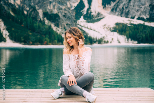 Beautiful girl long flowing hair sits on wooden pier, legs lotus position, hand near head smiles enjoy nature relax silence beauty of alpine Lake Braies. Backdrop white mountains green forest water