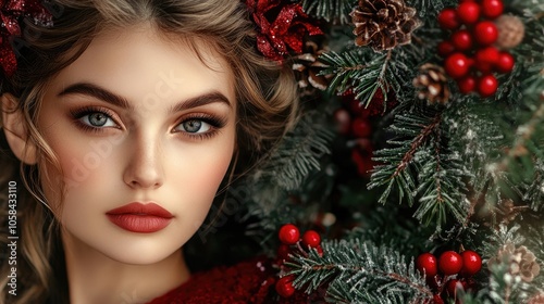 Beautiful girl model with a stylish hairdo and festive makeup captures the spirit of Christmas. The image highlights a charming Christmas vibe, perfect for seasonal designs with ample copy space.