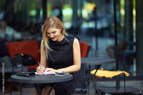 Beautiful girl sitting on the table and do her work, talk at phone, write mail
