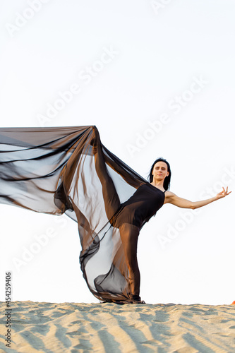 Beautiful girl with black fluttering cloth posing on the sand dune