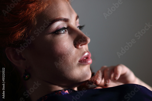 Beautiful girl with professional makeup, big eyes and long eyelashes, gazing into the distance