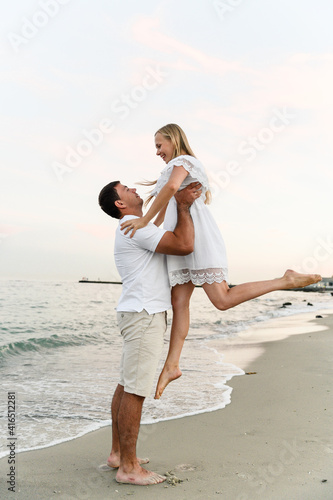 beautiful girl with white hair kisses her husband on the cheek on the beach near the ocean at sunset. romantic walk. vacation of a young family. travel to the sea.